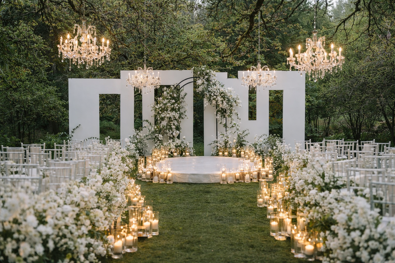 光与时间仪式举办于开阔的自然景观之中,光线充沛,视野开阔。随着夕阳西下,氛围逐渐变得柔和,宾客们在烛光晚餐中尽享美好时光,并在树下翩翩起舞。